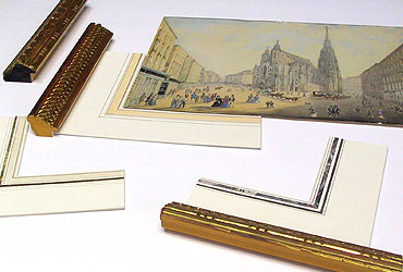 Auch Rahmen für zeitgenössische Malerei und Graphik nach eigenen Entwürfen, Passepartout mit Lavis für Graphik und Aquarelle sowie die richtige konservatorische Montage der Objekte z.B. säurefreie und alterungsbeständige Kartons, UV- Schutzgläser runden das Angebot ab.